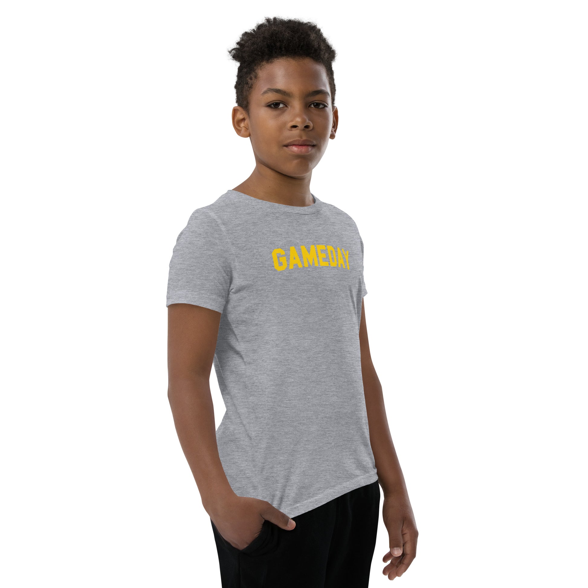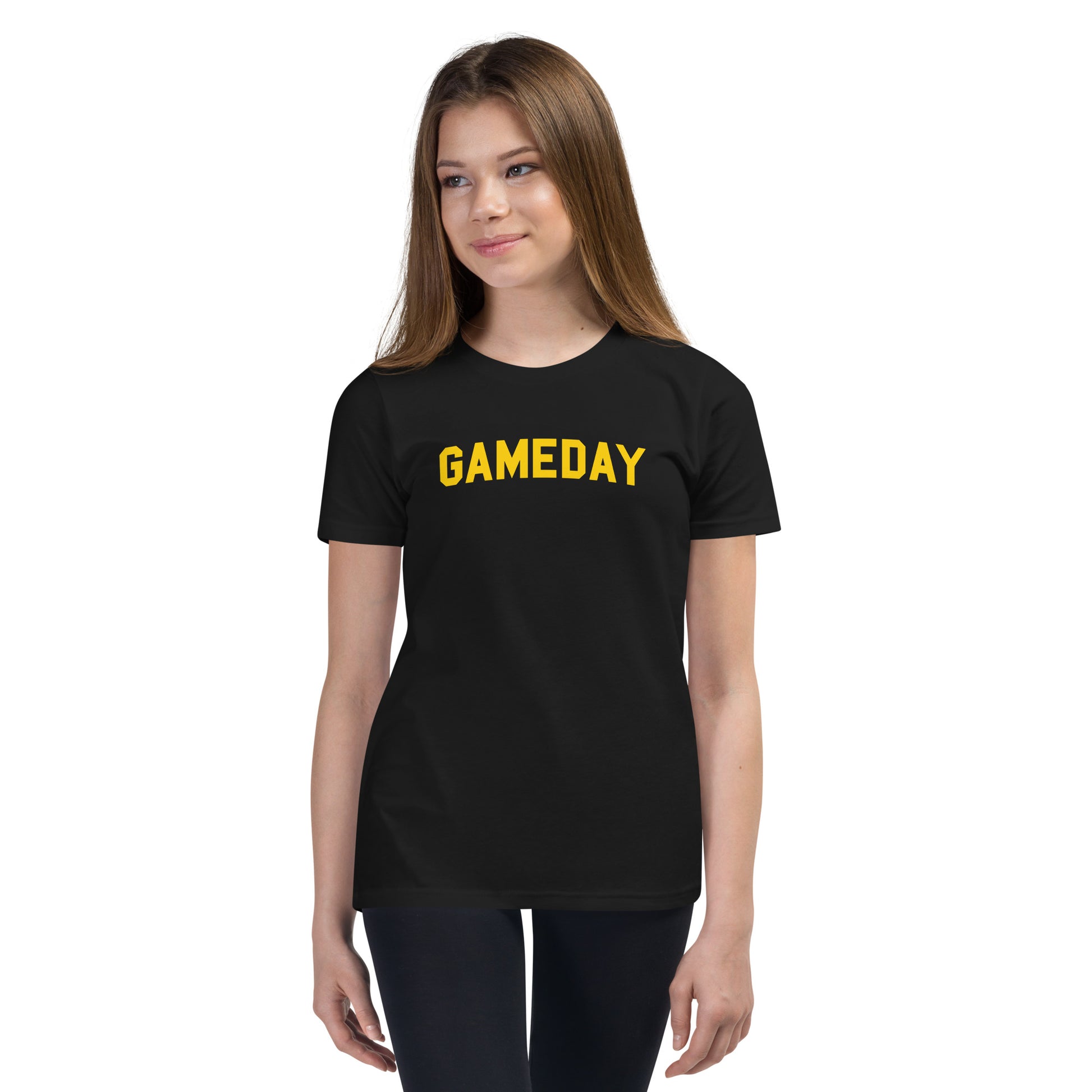 Ignite your young Hawkeye's spirit with our premium youth Hawkeye Game Day t-shirt. This eye-catching design features bold "GAMEDAY" text emblazoned across the chest in vibrant Iowa gold, perfectly capturing the electric atmosphere and unwavering passion of Hawkeye football that's ideal for passing down to the next generation of fans.