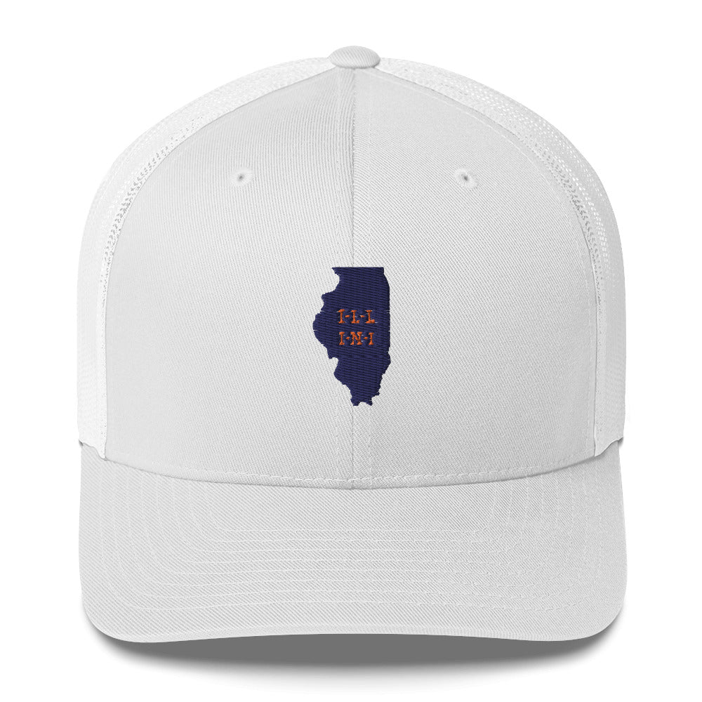 This classic trucker hat features a high-quality, structured front panel emblazoned with the Illinois state outline and the powerful "I-L-L" and "I-N-I" text, capturing the essence of the cheer that has reverberated through the halls of the Urbana-Champaign campus and beyond. The nostalgic design pays homage to the unwavering spirit and camaraderie that define the Fighting Illini community.