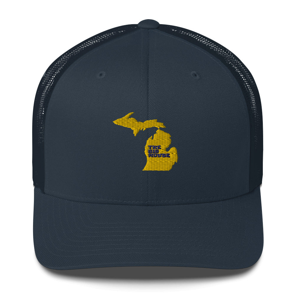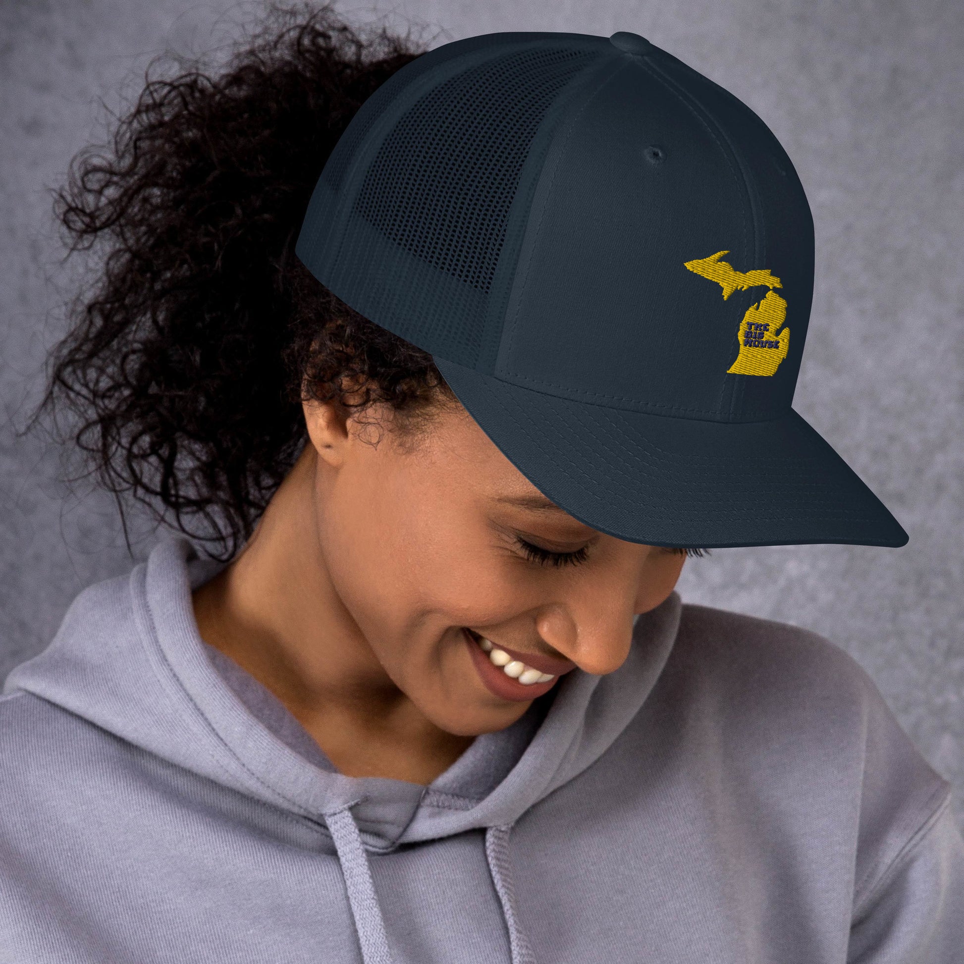 Crafted with a high-quality, structured front panel, this trucker hat features a bold, embroidered design of the Michigan state outline, adorned with the words "The Big House" – a nickname that has become synonymous with the unparalleled size, strength, and spirit of the Wolverines' home turf. The sleek, yet powerful design captures the essence of Michigan's football legacy and the indelible impact the stadium has had on generations of fans, players, and coaches.