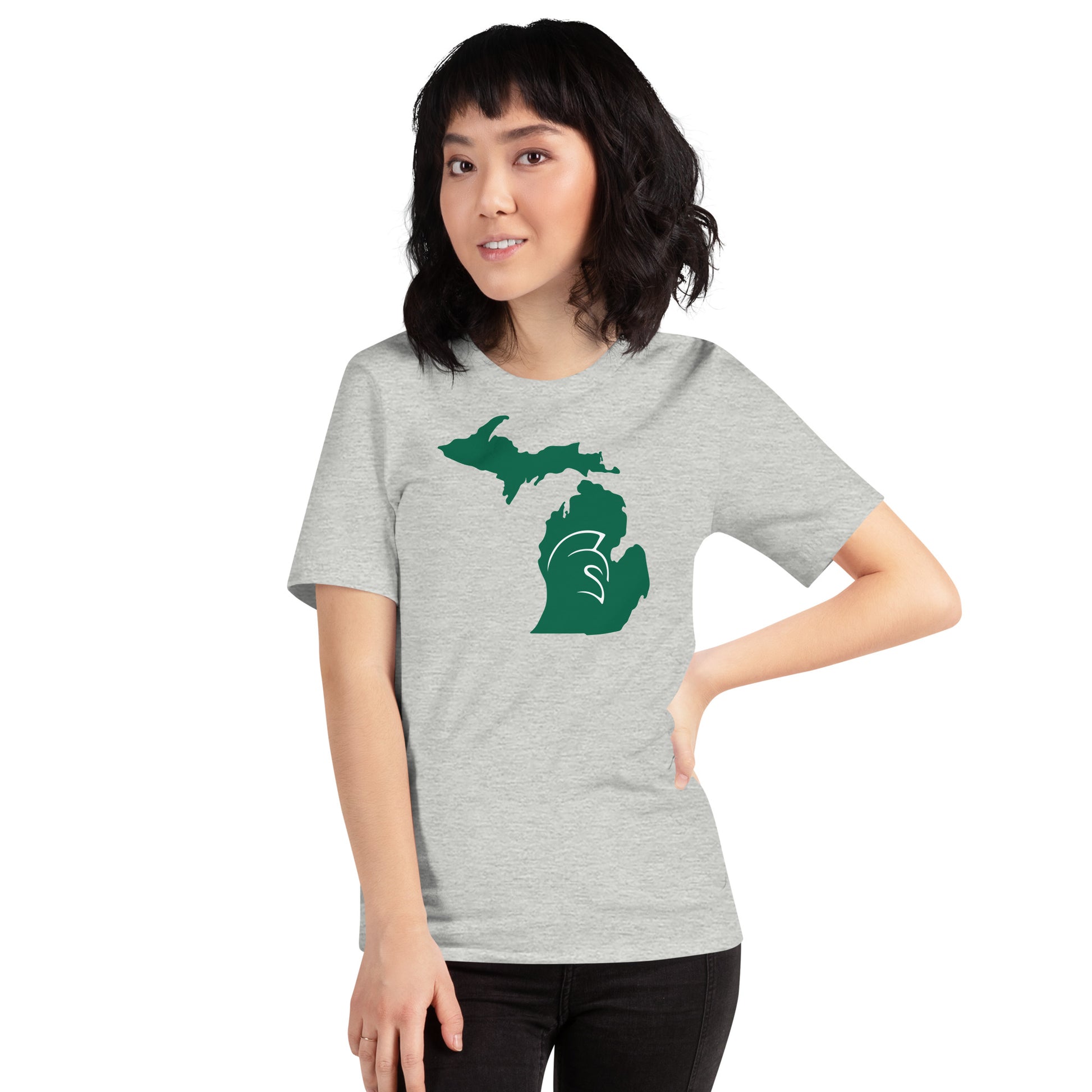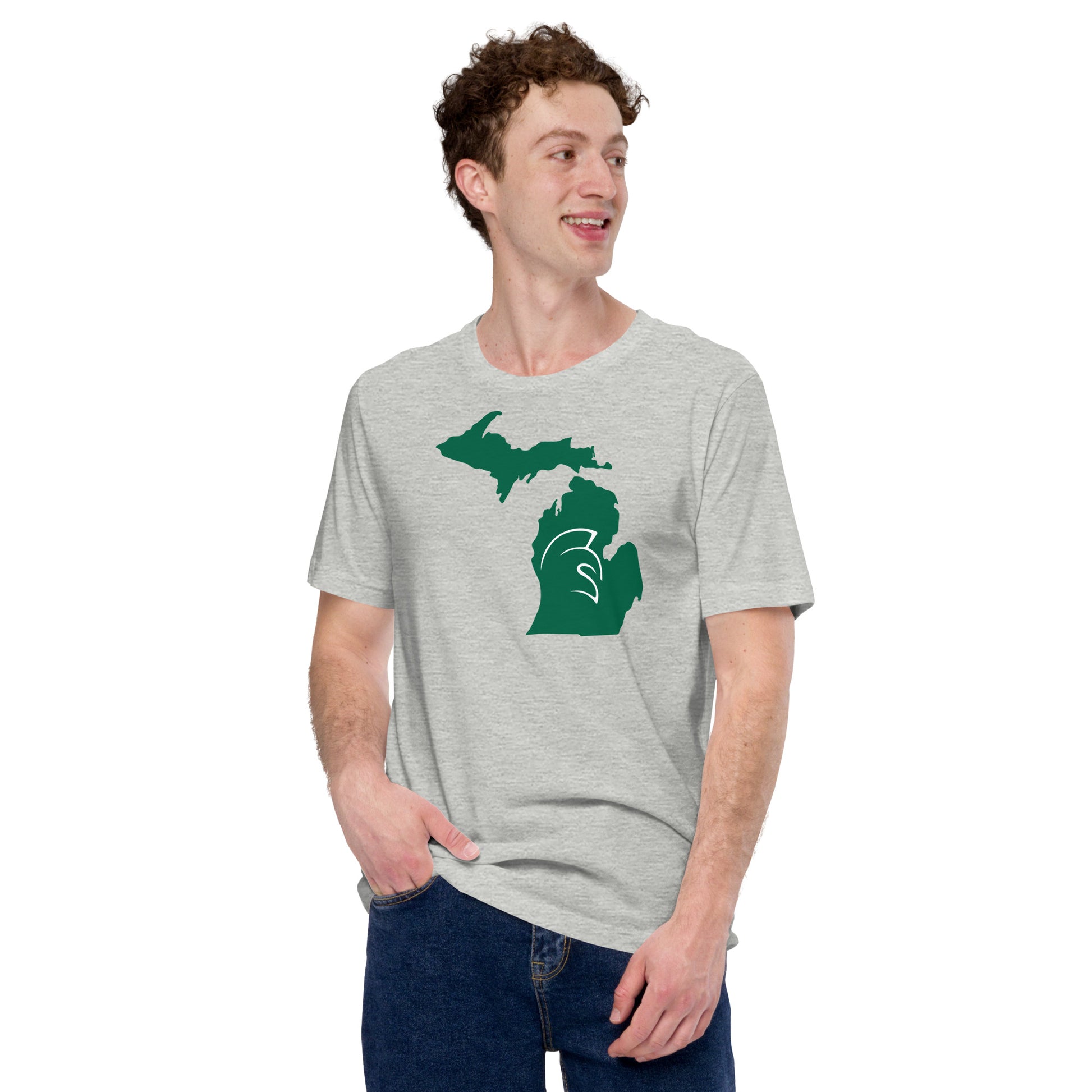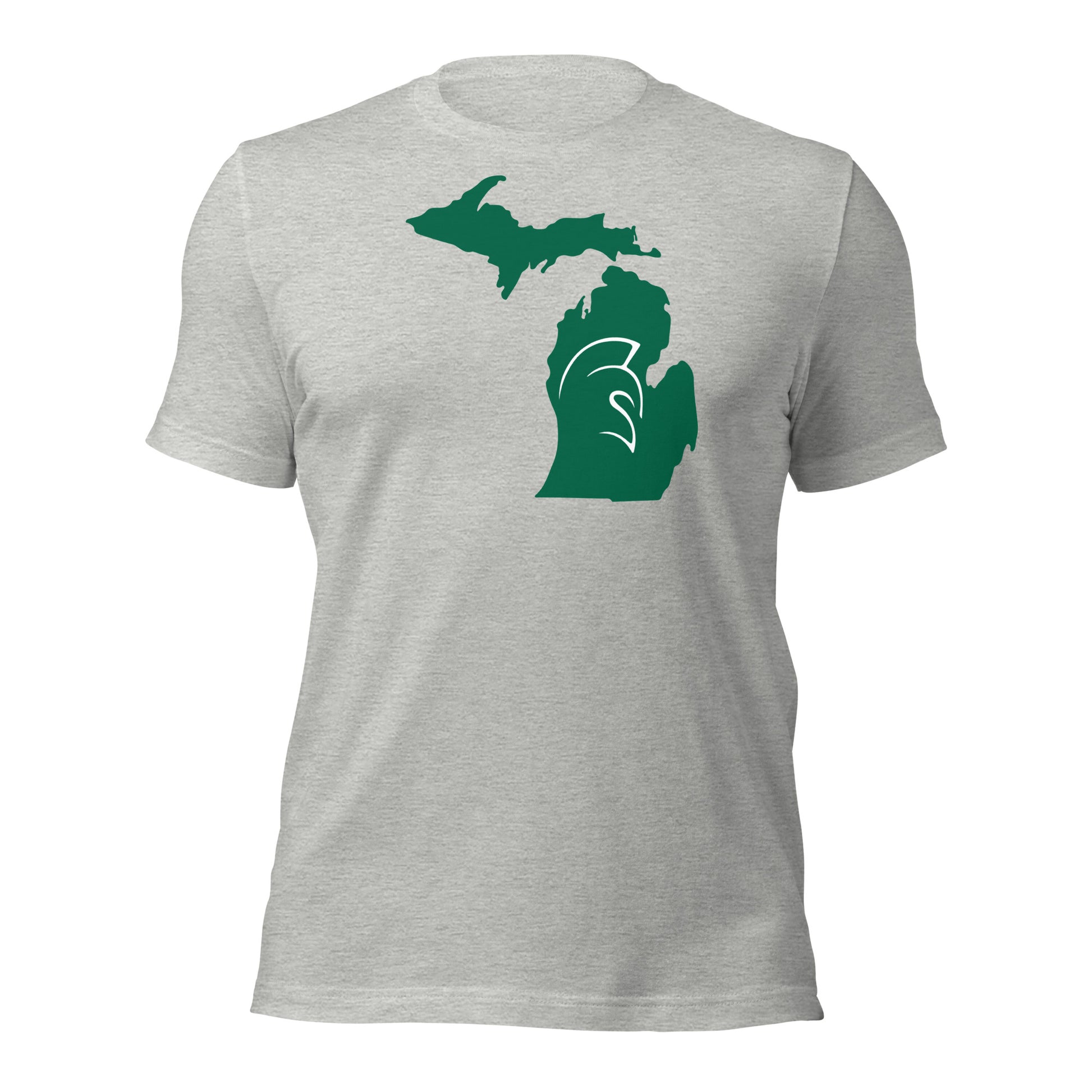- Meticulously detailed, screen-printed design featuring the iconic Spartan helmet within the Michigan state outline