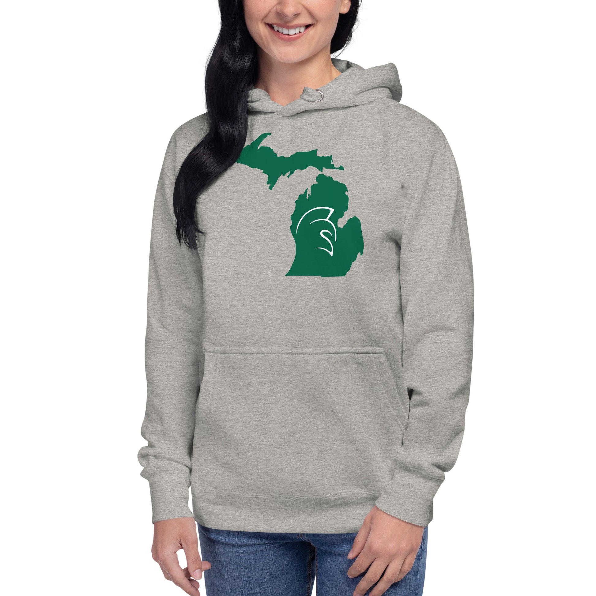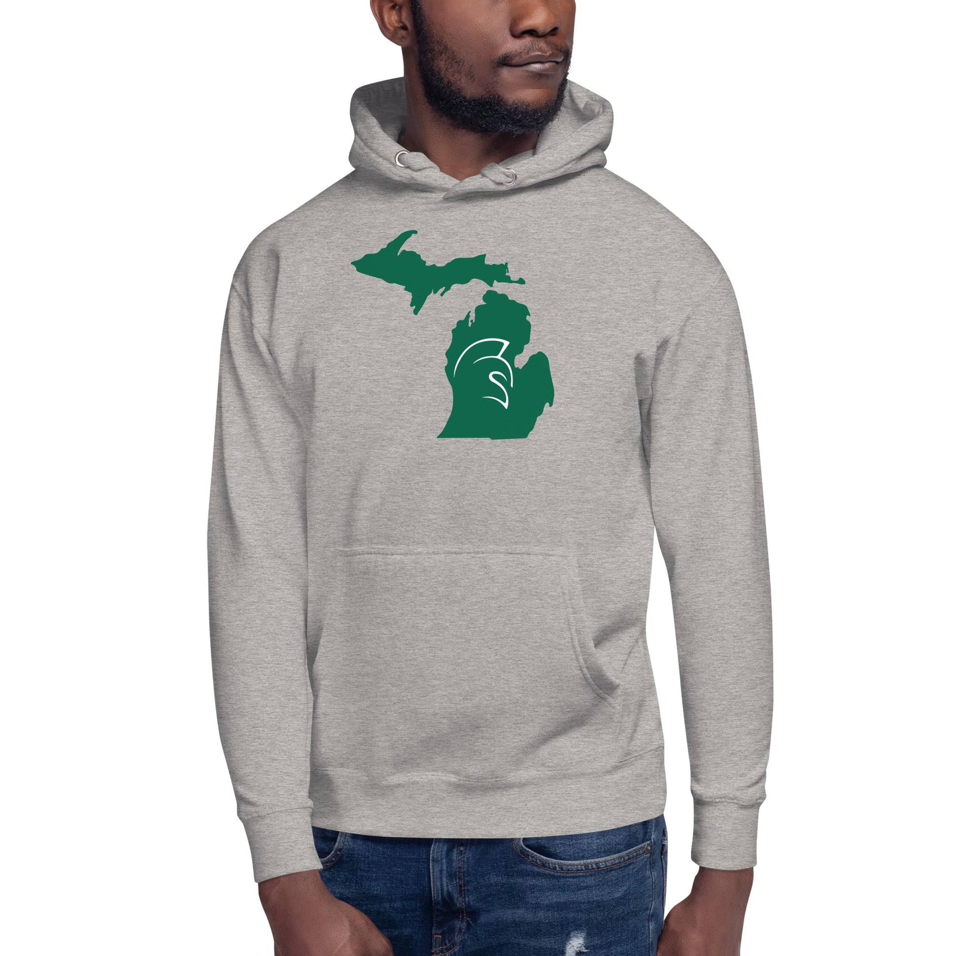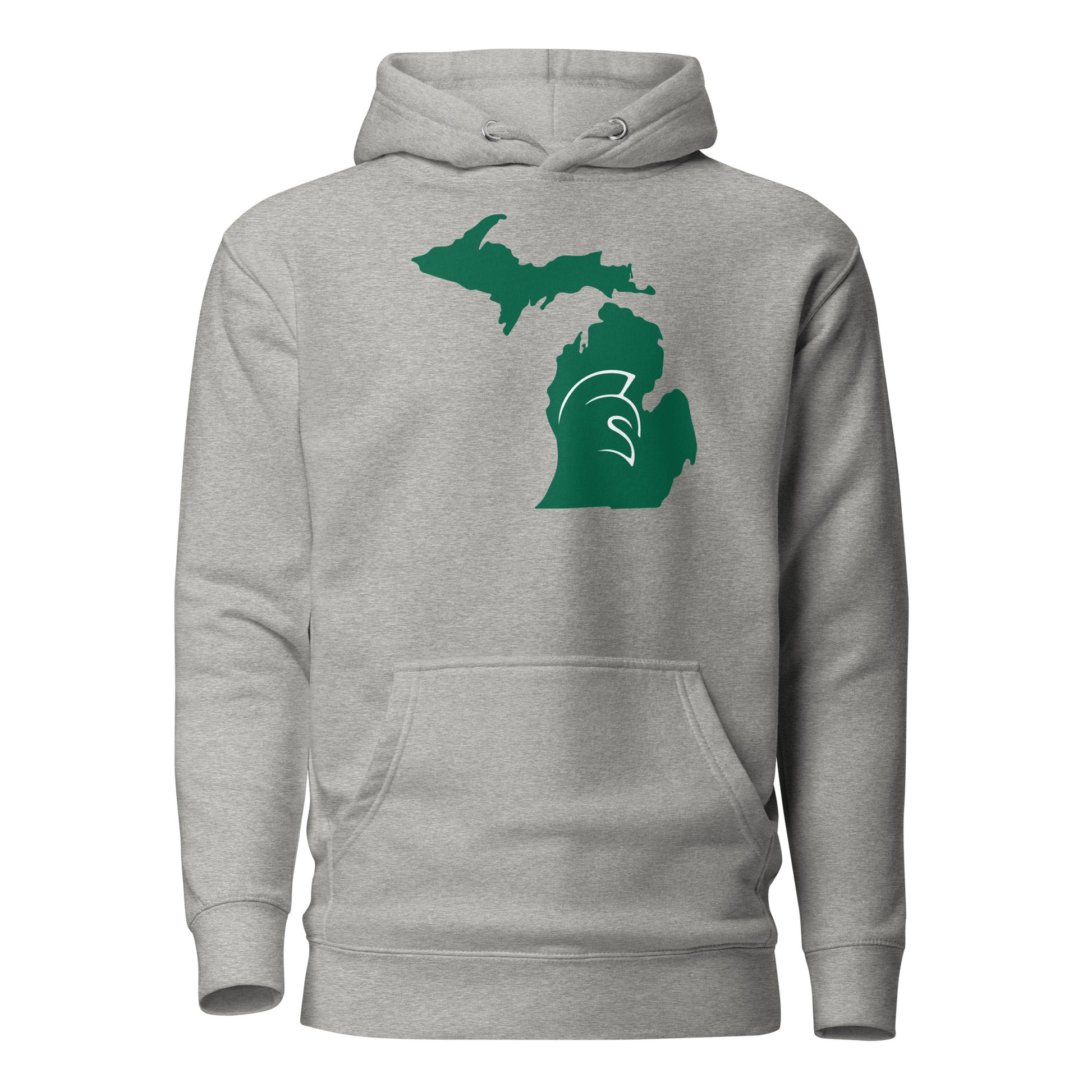 Embrace the spirit of Michigan State University and stay warm in style with our premium "Spartan Helmet" hoodie. This commanding design showcases the iconic Spartan helmet, a symbol of strength, courage, and resilience, nestled within the outline of the great state of Michigan – the heart and home of MSU.