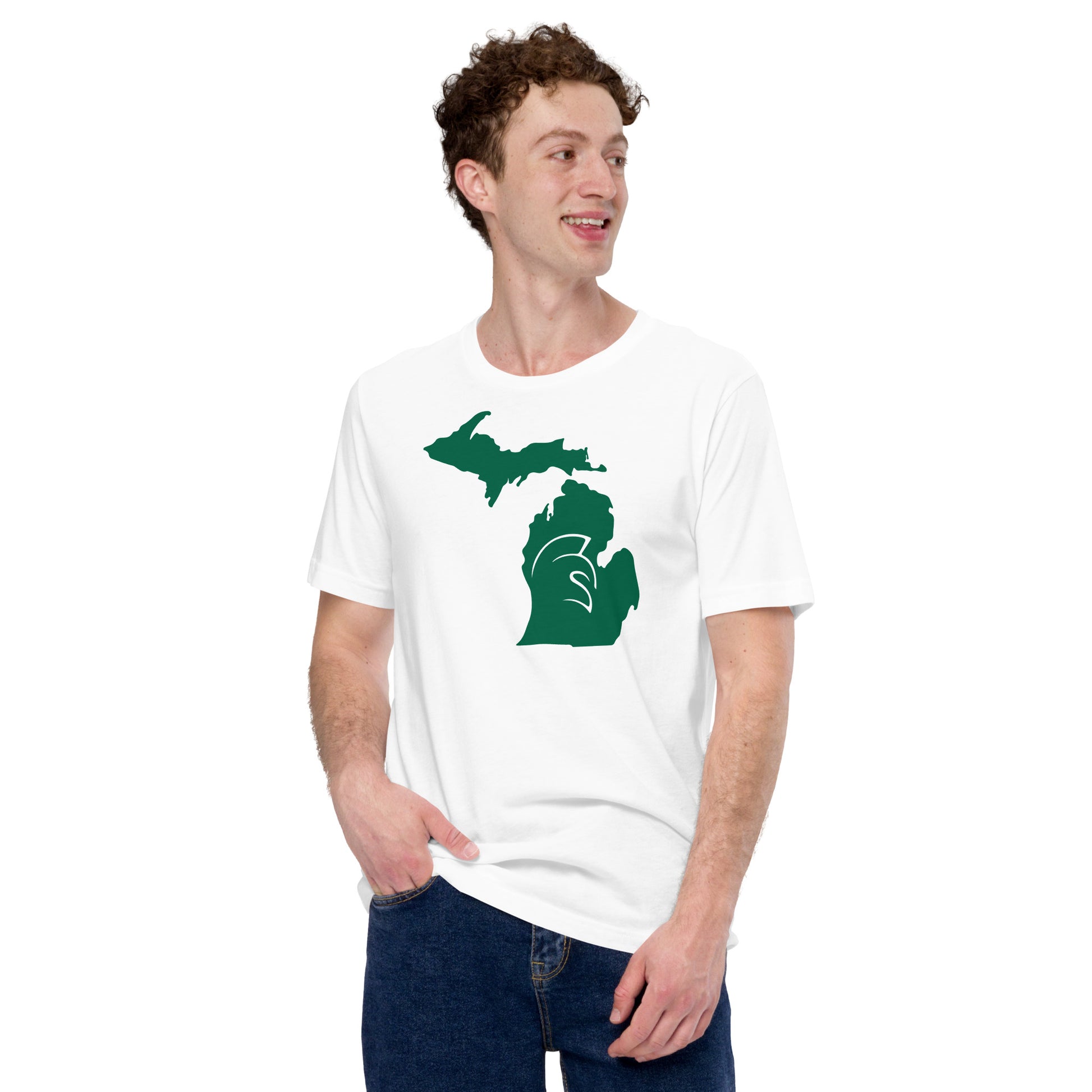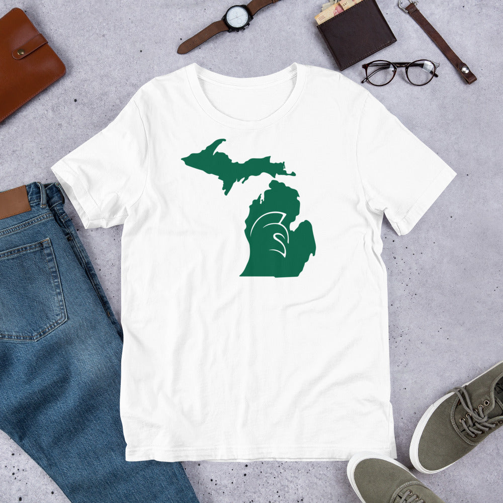 Crafted from high-quality, ultra-soft materials, this t-shirt features a meticulously detailed, screen-printed design that combines the instantly recognizable Spartan helmet with the shape of Michigan, creating a stunning visual representation of the university's deep-rooted connection to the state. The bold, green-and-white color scheme perfectly captures the essence of Spartan pride and ensures that your loyalty to MSU is unmistakable.