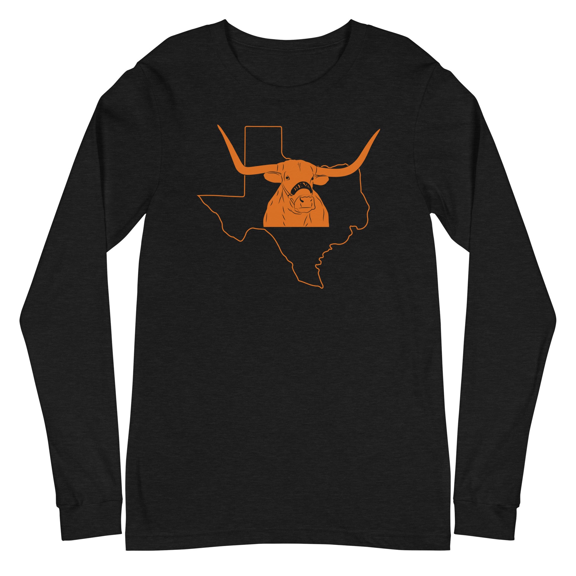 Showcase your unwavering Texas Longhorns pride with our premium "Bevo" long sleeve t-shirt, featuring a powerful and iconic design that combines the legendary longhorn mascot with the Lone Star State's unmistakable silhouette. This eye-catching shirt is a must-have for any die-hard University of Texas fan looking to display their allegiance to one of the most storied programs in college sports history.