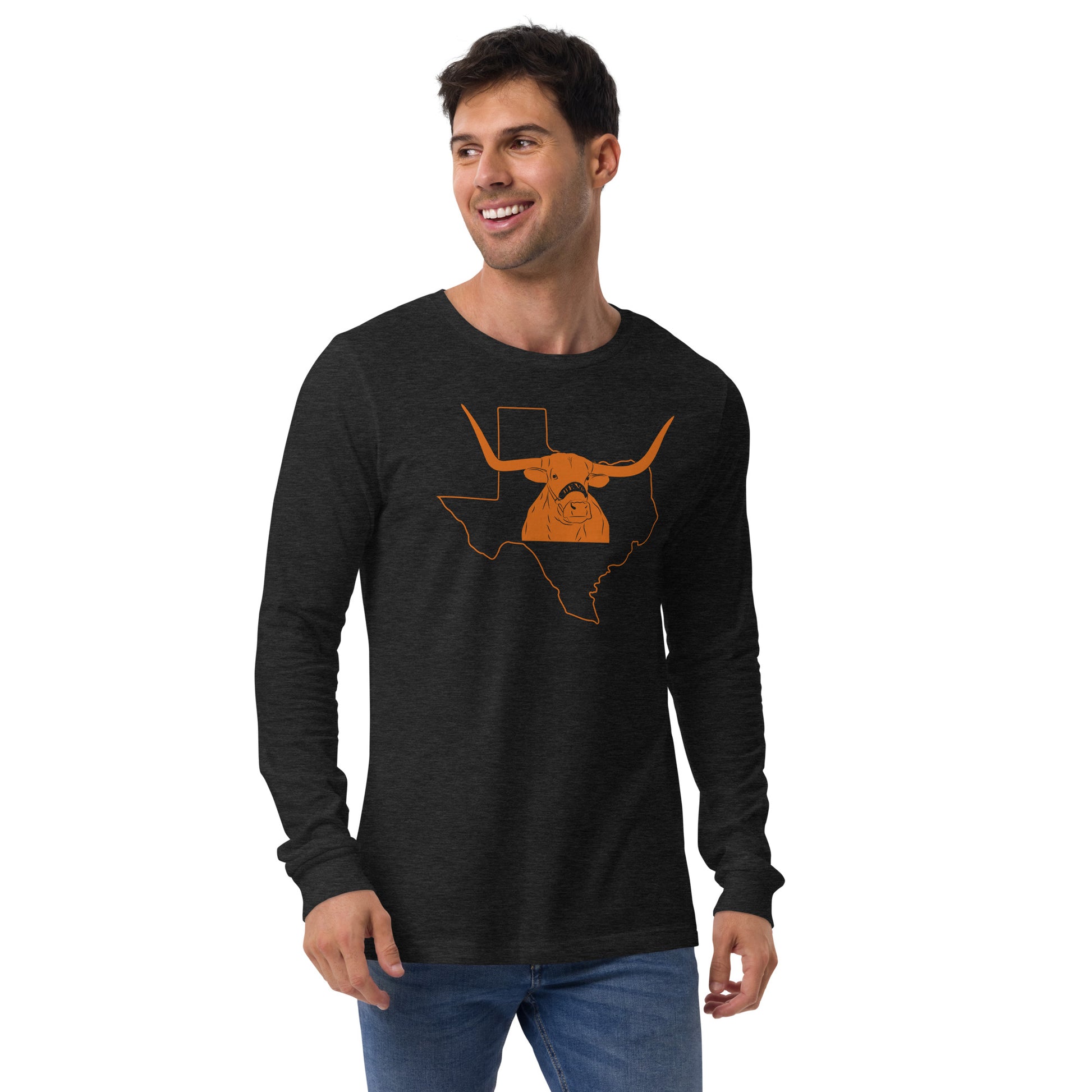 Meticulously crafted from top-quality, ultra-soft materials, this long sleeve t-shirt offers unparalleled comfort and durability, ensuring that you can wear your Longhorns spirit with pride, day in and day out. The striking design features a detailed rendering of Bevo, the beloved Texas mascot, prominently displayed in the foreground, while the outline of the state of Texas serves as a bold backdrop, emphasizing the deep-rooted connection between the university and the state it calls home.