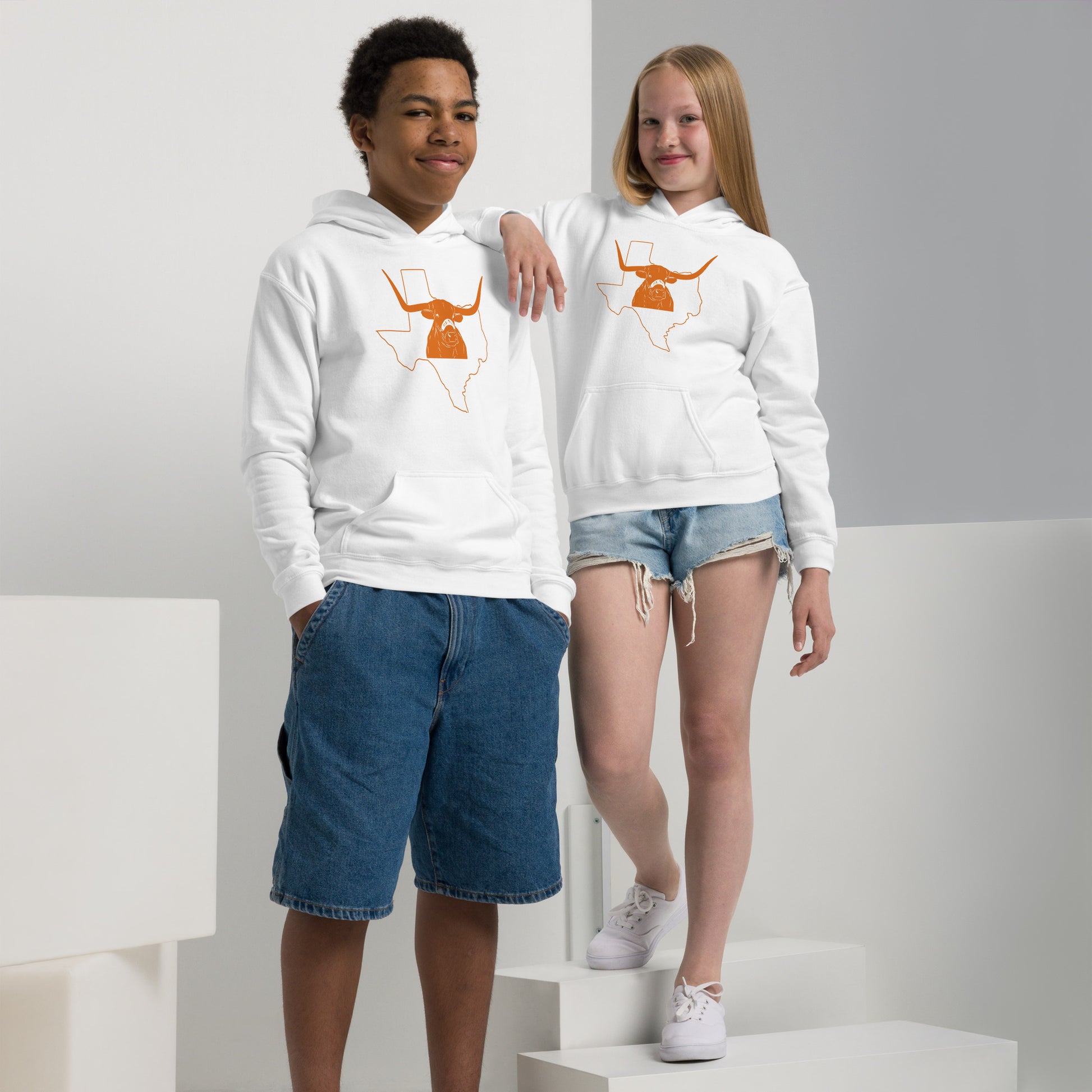 Wrap your little Longhorn in the warmth and spirit of Texas football with our premium youth "Bevo the Longhorn" hoodie. This cozy and eye-catching design showcases the iconic silhouette of Bevo, the beloved mascot of the University of Texas, set against the unmistakable outline of the Lone Star State. It's the perfect way to instill Longhorn pride and keep your young fan comfortable in any weather.