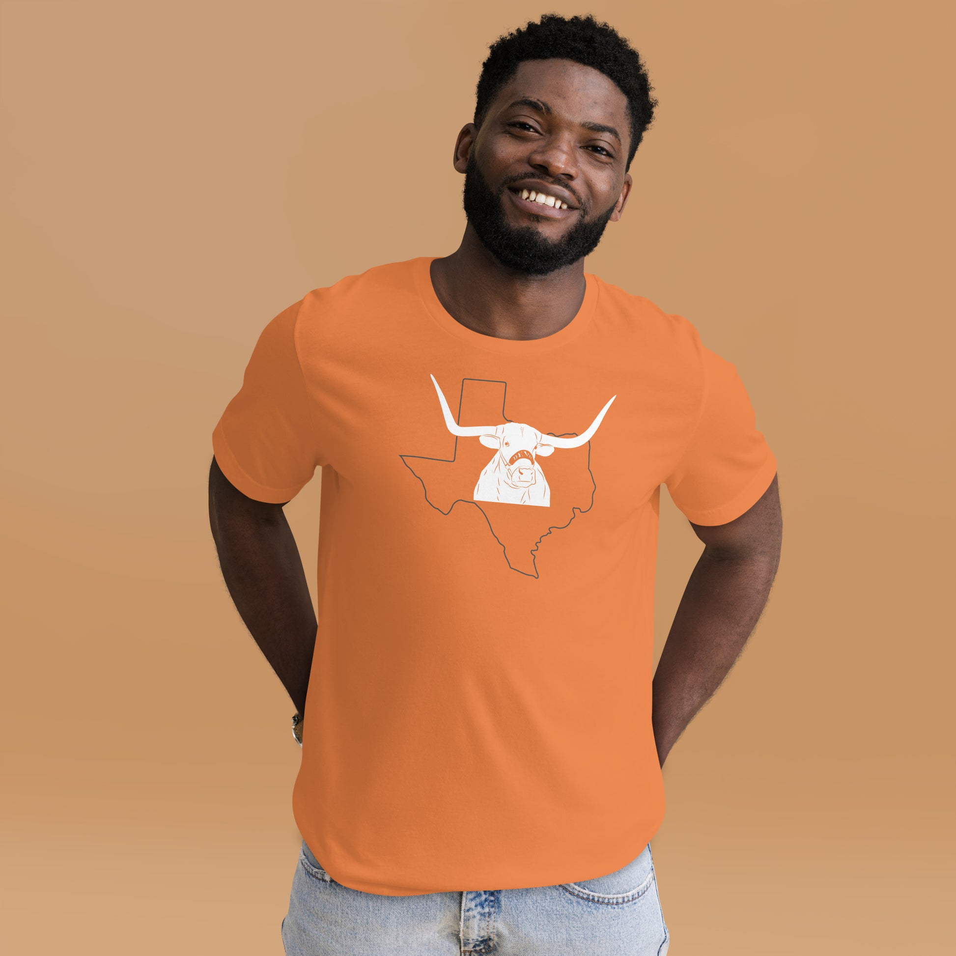 As a proud owner of this premium t-shirt, you'll be carrying on the legacy of the countless University of Texas alumni who have made their mark on the world, from legendary athletes to influential leaders. The iconic Bevo and Texas outline design encapsulates the unrivaled spirit, pride, and excellence associated with the Longhorns, and by wearing this shirt, you're declaring your place in that storied history.