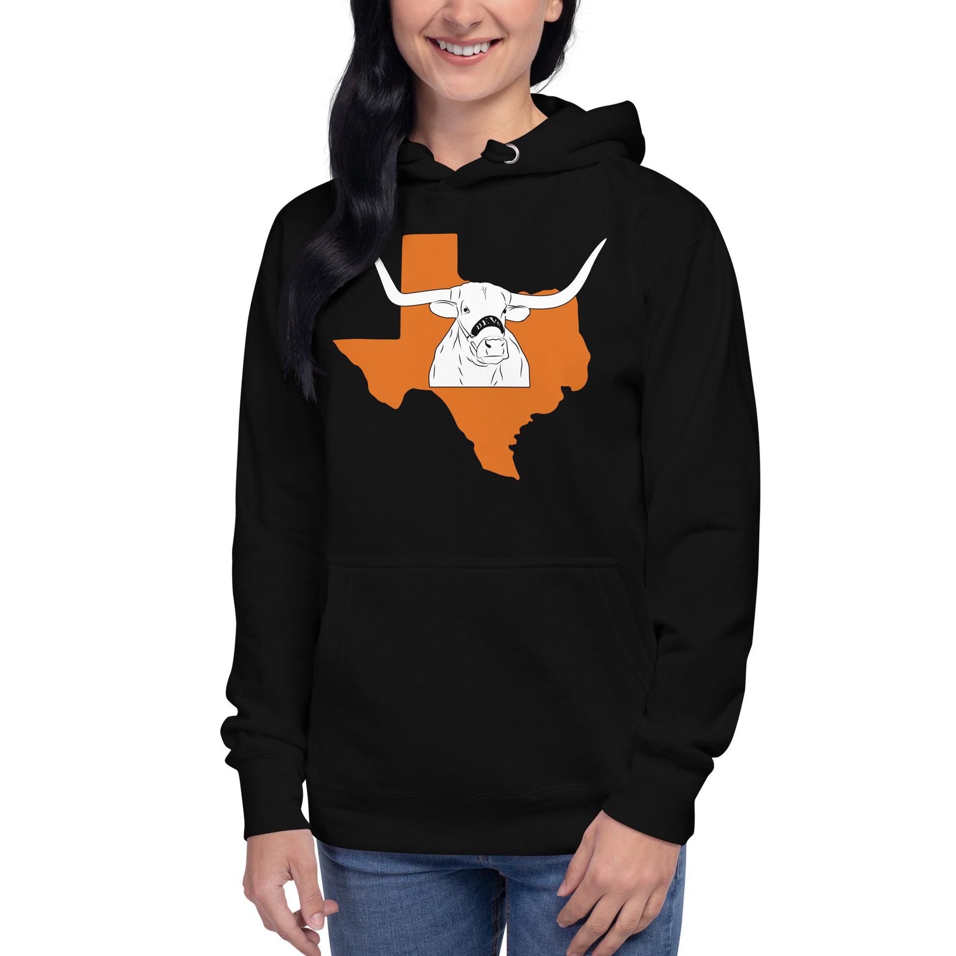 Meticulously crafted from top-quality, ultra-soft, and plush materials, this hoodie offers unparalleled comfort, warmth, and durability, ensuring that you can wear your Longhorns spirit with pride, no matter the temperature. The striking design features a detailed rendering of Bevo, the beloved Texas mascot, prominently displayed in the foreground, while the outline of the state of Texas serves as a bold backdrop, emphasizing the deep-rooted connection between the university and the state it calls home.