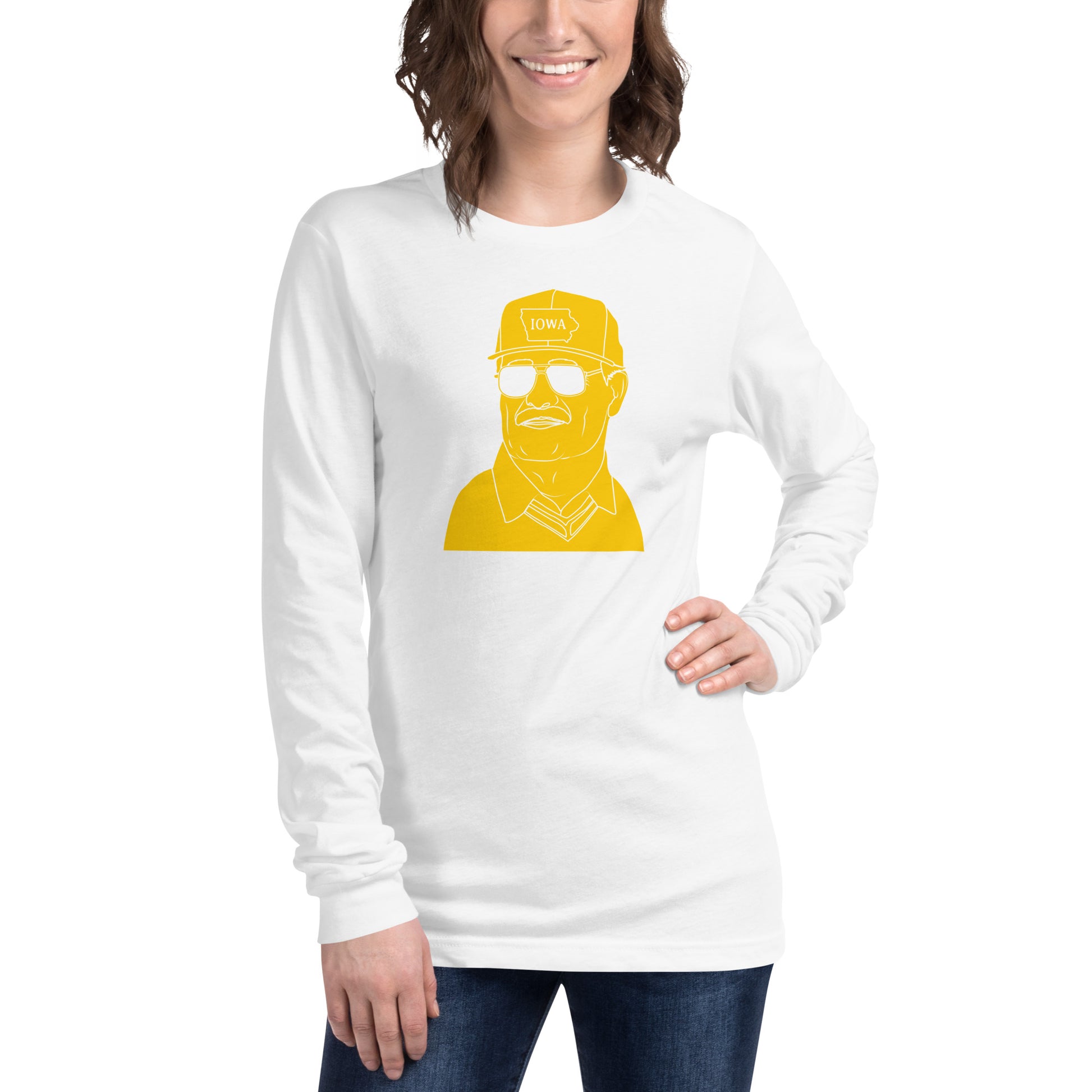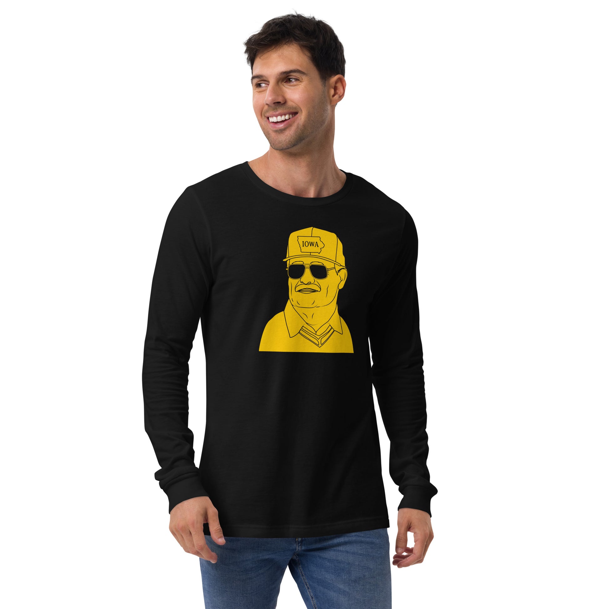 Celebrate the legendary legacy of the University of Iowa Hawkeyes and honor one of the most iconic coaches in college football history with our premium "The Hayden" long sleeve t-shirt. This striking design features a powerful silhouette of Coach Fry, capturing his unmistakable presence and the indelible mark he left on the Iowa football program.
