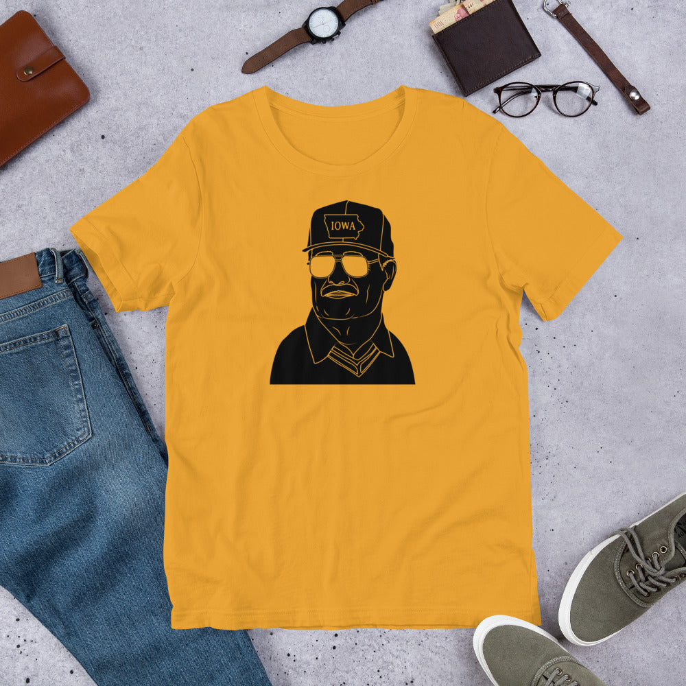 Don't miss your chance to own a piece of Iowa football legacy and honor the incomparable Hayden Fry. Click "Add to Cart" now and secure your "The Hayden" t-shirt today. Wear it with pride and let the world know that you stand with the Hawkeyes and the enduring spirit of Coach Fry. Order now and join generations of Iowa fans in celebrating the coach who forever changed the face of Hawkeyes football!