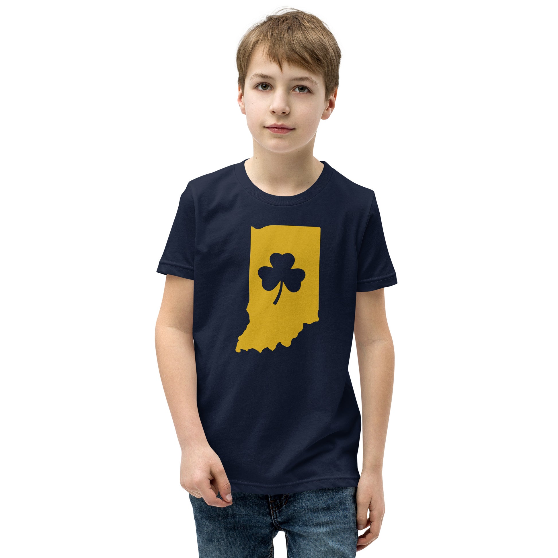Introduce your little Fighting Irish fan to the spirit of Notre Dame with our premium youth "Shamrock State" t-shirt. This eye-catching design cleverly combines the iconic Notre Dame shamrock with the proud outline of Indiana, perfectly capturing the university's deep-rooted connection to the Hoosier State.