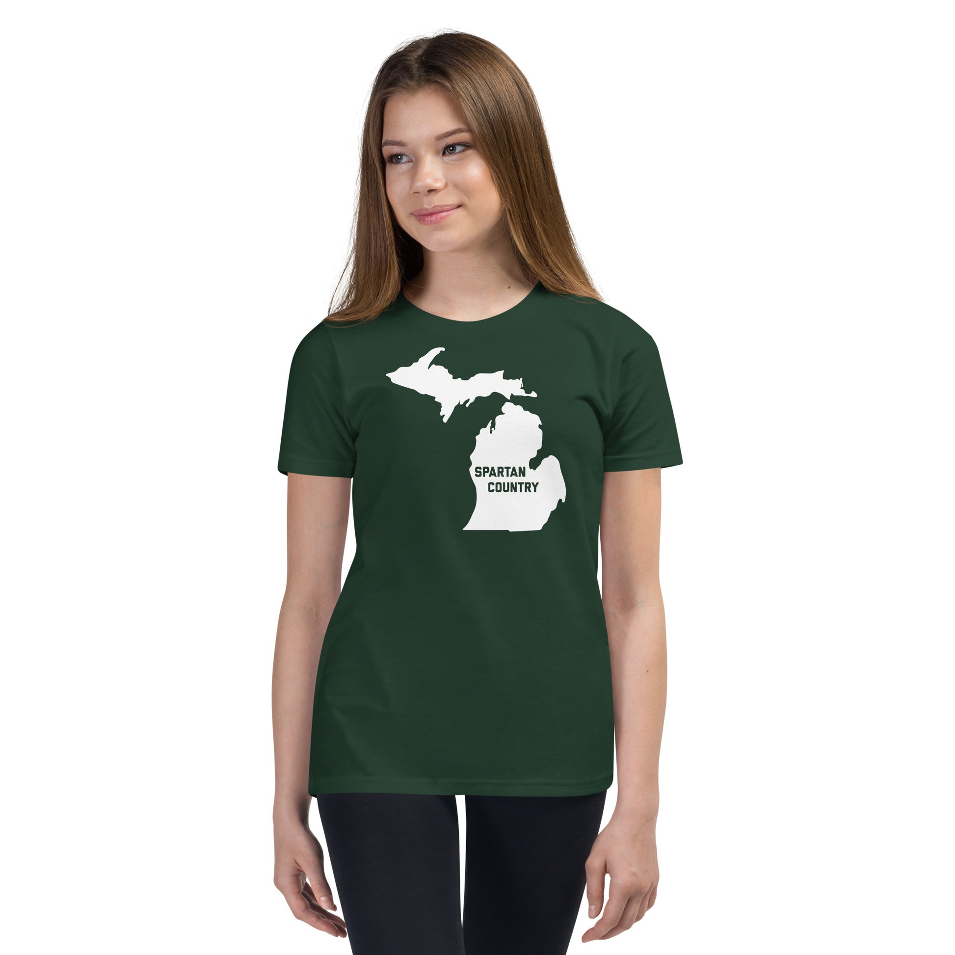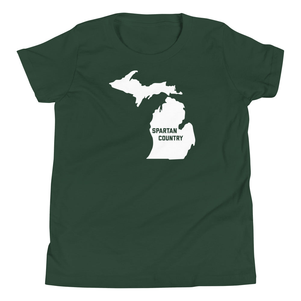 Ignite your young Spartan's pride with our premium youth "Spartan Country" t-shirt, celebrating the spirit of Michigan State University. This eye-catching design features the bold "SPARTAN COUNTRY" text emblazoned within the iconic outline of Michigan, perfectly showcasing MSU's deep-rooted connection to the Great Lakes State.