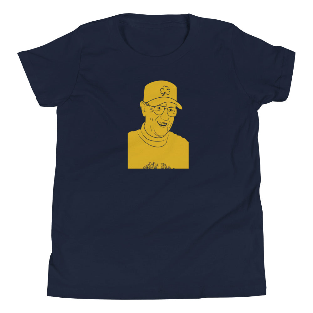 Introduce your little Fighting Irish fan to the unparalleled legacy of the University of Notre Dame and inspire them with our premium youth "The Lou" t-shirt. This iconic design features a striking silhouette of Coach Lou Holtz, capturing his legendary presence and the indelible mark he left on the Notre Dame football program, making it the perfect way to pass down Fighting Irish pride to the next generation.