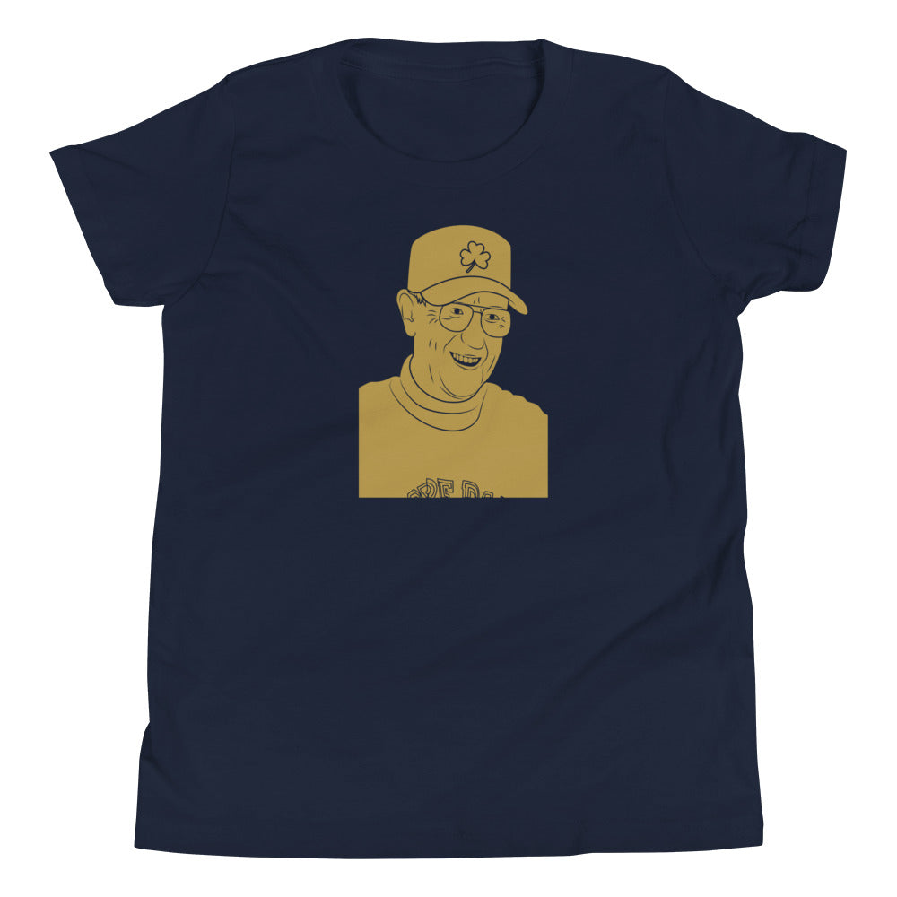 Introduce your little Fighting Irish fan to the unparalleled legacy of the University of Notre Dame and inspire them with our premium youth "The Lou" t-shirt. This iconic design features a striking silhouette of Coach Lou Holtz, capturing his legendary presence and the indelible mark he left on the Notre Dame football program, making it the perfect way to pass down Fighting Irish pride to the next generation.